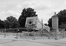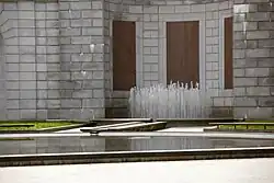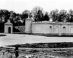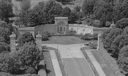 The Hemicycle is a Neoclassical[34] semicircle 30 feet (9.1 m) high and 226 feet (69 m) in diameter.[25][26] As planned, it served as a retaining wall for the hill behind it.[35] In the center is an apse 20 feet (6.1 m) across and 30 feet (9.1 m) high.[3][26] In total, the Hemicycle covers 4.2 acres (1.7 ha).[36] The walls ranged from 3 feet 6 inches (1.07 m) thick at the base to 2 feet 6 inches (0.76 m) at the top.[37] The accent panels and coffers in the apse were inlaid with red granite from Texas.[37] The Great Seal of the United States was carved in granite in the center of the apse arch, while on either side were seals of the United States Department of the Army (south) and the United States Department of the Navy (north).[25][38] Along the facade of the Hemicycle were 10 false doors or niches which were intended to house sculptures, memorial reliefs, and other artworks (which would act as memorials).[12] The outer, middle, and inner niche on each side was circular and 3 feet 6 inches (1.07 m) deep, while the other two niches between them were 2 feet (0.61 m) deep, rectangular, and had an oak leaf carved into the rear wall. All the niches were 9 feet (2.7 m) wide and 19 feet (5.8 m) high.[25][39] The apse originally held a fountain,[40] although by the 1990s it had not been used in many years.[39] A circle of unkempt grass filled the central plaza embraced by the Hemicycle's wings.[41]