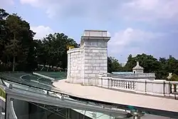 On top of the Hemicycle was a terrace 24 feet (7.3 m) wide. Originally, access to the terrace was granted only by going to the either end of the Hemicycle, through a pedestrian gate, and up some stairs. Above each arched entrance to the pedestrian stairs was a granite eagle. But these entrances were never opened and remained locked for more than 50 years.[39]