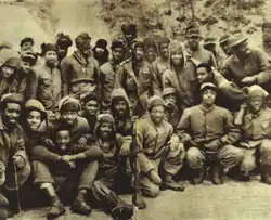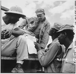 African Americans were typically placed into labor battalions with around 160,000 of the 200,000 African Americans who were shipped out to France in 1917 finding themselves placed in one. These labor battalions were viewed as being the "dregs of the military forces" and the men in them were "driven to the brink of physical and emotional exhaustion".[70] Jim Crow was extended to the camps where the African American soldiers were stationed and white officers would frequently remind African American soldiers of this. The 370th Infantry Regiment were informed a black member of a labor battalion had recently been hanged in the same square the unit was now assembling in a small town outside the Lorraine region.[71]