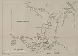 The hand-operated 600mm-gauge railway line from Ridhwaniya to Baghdad connected the Euphrates with Baghdad.[6] It ran south of the old caravan route from Aleppo via Falluja to Baghdad.[7] It began near the mouth of the Ridhwaniya Canal and led to Baghdad via Abu Thubba, Tel Aswad and the Baghdad suburb of Kharr. In May 1916, the wagons were still pushed by hand.[8][6]