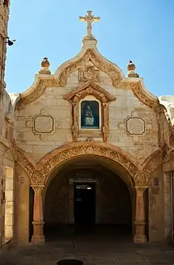 The Chapel of the Milk Grotto of Our Lady (Latin: Crypta lactea; Arabic: كنيسة غار الحليب, romanized: Kanīsat ḡār Al-ḥalīb), also called Grotto of Our Lady or Milk Grotto, is a Catholic chapel in Bethlehem, in the West Bank, erected in 1872.[1][2][3][4] Since Byzantine times, the place has been a center of Christian pilgrimage, maintained since its last erection together with its Marian shrine and monastery by the Custody of the Holy Land of the Order of the Friars Minor of the Catholic Church in Palestine. The Status Quo, a 250-year-old understanding between religious communities, applies to the site.[5][6]