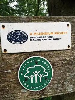 ![]() Logo for the project (green), below the logo of The Millennium Commission seen here on a signpost at Mugdock Country Park. | |