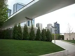 The BP Pedestrian Bridge is a girder footbridge over Columbus Drive that connects Millennium Park with Maggie Daley Park (formerly, Daley Bicentennial Plaza), both parts of the larger Grant Park. The pedestrian bridge is the first bridge Gehry designed to be built, and was named for BP plc, which donated $5 million to the construction of the park.[131][132] It opened on July 16, 2004, along with the rest of Millennium Park.[133] Gehry had been courted by the city to design the bridge and the neighboring Jay Pritzker Pavilion, and eventually agreed to do so after the Pritzker family funded the Pavilion.[20][24][25] The bridge is known for its aesthetics, and Gehry's style is seen in its biomorphic allusions and extensive sculptural use of stainless steel plates to express abstraction. The bridge is referred to as snakelike in character due to its curving form.[134] The bridge's design, which meets highway standards to accommodate rushes of pedestrian traffic simultaneously exiting Pritzker Pavilion events,[135] enables it to bear a heavy load.[134]