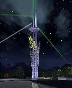 The site is served by a main road, so the two structures will be linked via an underground arcade. The tower consists of three cylindrical concrete pillar-like structures varying in height and linked together near the tower's first peak using a disc-shaped section that is intended to house in its two floors an observation deck and a viewing restaurant. Around the pillars of the tower, three transparent stainless steel wings wrap around the base of the tower and gradually open outwards in a fan-like fashion as they extend up the height of the tower.[5]