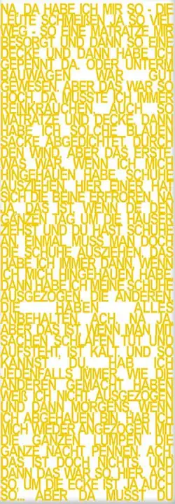 His most recent series of Transfigurative Paintings unveils a completely different setting: unemployment, homelessness and social – that is: public – invisibility. In contrast to the women's portraits in which, by looking at the figure-less images, we rely on our memorized images to try to recall the women's "real" faces as we know them from the media, in Marković's portraits of homeless men, we are facing pictures of individuals who are anonymous to us, as they belong to a social group that each society in which they live tends to make invisible. These text portraits are based upon interviews Marković performed with homeless men in various world capitals. They represent the men's identities through their life stories; the real person is transfigured via an autobiographical text that is fixed onto canvas with pigments.