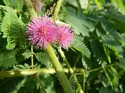 Mimosa pudica (also called sensitive plant,[3] sleepy grass,[4] sleepy plant,[3] action plant, humble plant, touch-me-not, touch-and-die, or shameplant)[5][2] is a creeping annual or perennial flowering plant of the pea/legume family Fabaceae. It is often grown for its curiosity value: the sensitive compound leaves quickly fold inward and droop when touched or shaken and re-open a few minutes later. For this reason, this species is commonly cited as an example of rapid plant movement. Like a number of other plant species, it undergoes changes in leaf orientation termed "sleep" or nyctinastic movement. The foliage closes during darkness and reopens in light.[6] This was first studied by French scientist Jean-Jacques d'Ortous.[7] In the UK it has gained the Royal Horticultural Society's Award of Garden Merit.[5][8]