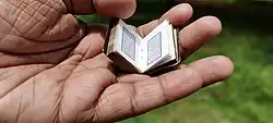 Thumbnail Quran (Arabic: مُصْحَفٌ مُصَغَّرٌ; Persian: قرآن بندانگشتی) or Miniature Quran are tiny-written Qurans having 2 types: Modern and Antique. Newer versions are produced in China, United Arab Emirates and Iran. But the antique versions can have almost 2 cm length, 1.5 cm width and 1 cm thickness. Some of them in hexagon or octagon shapes and with a metal box and a gilded leather wrapper.[1] Very antique versions have fragile papers may be foxed in contact with air. Many versions date back to the Ottoman Empire era in Turkey, in Egypt dating back possibly to the Khedivate of Egypt, and production of them in England during WWI.[2] Some are also written in different translations, such as Persian.
