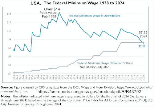 The federal minimum wage was introduced in 1938 at the rate of 25¢ per hour (equivalent to $5.19 in 2022).[77][5] By 1950 the minimum wage had risen to 75¢ per hour.[82][5] The purchasing power of the federal minimum wage has fluctuated; it was highest in February 1968, when it was $1.60 per hour.[77][78][82][83] The real value of the federal minimum wage in 2022 dollars has decreased by 46% since its inflation-adjusted peak in February 1968. The minimum wage would be $13.46 in 2022 dollars if its real value had remained at the 1968 level.[77][78] See chart to right. From January 1981 to April 1990, the minimum wage was frozen at $3.35 per hour, then a record-setting minimum wage freeze. From September 1, 1997, through July 23, 2007, the federal minimum wage remained constant at $5.15 per hour, breaking the old record. On July 24, 2008, the minimum wage was adjusted to $6.55, and then to $7.25 on July 24, 2009, where it has remained fixed as of 2024.[5]