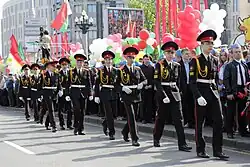 Today, the school grants admission to students as young as 12 years old (from the sixth grade).[6] In the 2007–2008 academic year, the entire course was made of 105 cadets, which is larger to its usual limit of 100 cadets. Around 12,000 graduates attended a training course in this elite institution. More than 50 alumni became generals, among them three Ministers of Defense. The training of the cadets includes not only the school curriculum and military training, but also etiquette and dance training. In connection with the transition to the eleven-year education system in 2009, two companies (two courses) were graduated at once. Now the term of study in school is five years. Like its counterpart at the Moscow Military Music College in Russia, the corps of drums of the school opens annual parades on a national scale (e.g. Minsk Independence Day Parade, Victory Day Parades[7][8]). In 2018, the school took part in the planting of the Alley of Cosmonauts in the Botanical Garden of the National Academy of Sciences of Belarus.[9]