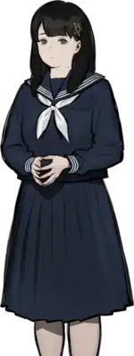 Mio Kurosuzu was created for Paranormasight: The Seven Mysteries of Honjo by the game's writer Takanari Ishiyama, and her design was created by the game's character designer, Gen Kobayashi.[1][2] Paranormasight is set in the Shōwa era, and characters' clothing, including Mio's, were designed with the era in mind.[1][3] She is a chubby girl who wears schoolgirl clothing typical of the Shōwa era in Japan and assists the police in spiritual investigations.[3] She also wears a talisman as a hair clip. According to Ishiyama, she was given a chubby design because he believed it would look cute.[1] She was intentionally designed to have more symbolism in her appearance without having so much that it would feel out of place.[4] Ishiyama described her as someone who typically does not want to have people see her hand gestures or purification of spirits, thus typically having a calm expression he says conveys "I'm hungry" despite her illustrations tending to have a serious expression.[5] Her name takes from the name of the protagonist of the manga Eko Eko Azarak.[2]