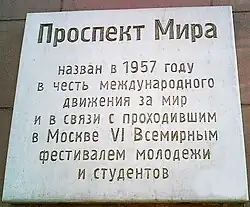 - ^ See the plaque above. "назван в 1957 года в честь международное движения за мир и в связи с проходившим в москве..." (Named in 1957 in honor of the International Peace Movement due to take place in Moscow")