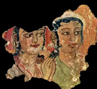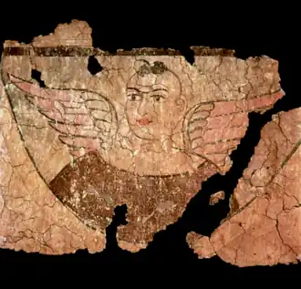 The ruins at Miran consist of a large rectangular fort, a monastery ('the Vihara' in Stein's accounts), several stupas and many sun-dried brick constructions,[6] located relatively close to the ancient caravan track to Dunhuang, running west to east. The many artifacts found in Miran demonstrate the extensive and sophisticated trade connections these ancient towns had with places as far away as the Mediterranean Sea. Archaeological evidence from Miran shows the influence of Buddhism on artistic work as early as the first century BC.[7] Early Buddhist sculptures and murals excavated from the site demonstrate a Serindian style similar to the traditions of western Central Asia and the Gandhara art of the northwest Indian subcontinent;[8] other artistic aspects of the paintings found there suggest that Miran had a direct connection with Rome and its provinces.[9]