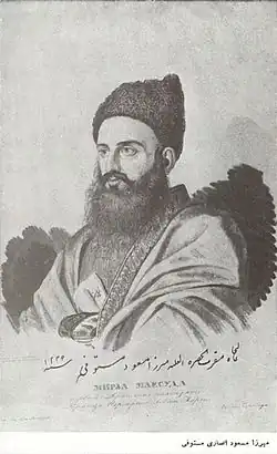 He was born in 1790. He was the son of Mirza Abdol Rahim Ansari and cousin of Mirza Saeed Khan Ansari. He became the secretary and translator of the crown prince Abbas Mirza since he was the first Iranian official to become fluent in French.[1] In 1829, following the murder of the Russian diplomat Alexander Griboyedov by the people of Tehran, a delegation led by prince Khosrow Mirza was sent to the Russian capital Saint Petersburg to apologize.[2] The delegation included Mirza Mohammad Khan Zangana, Mirza Masoud, Mirza Saleh Shirazi, Hossein Ali Beg (Khosrow Mirza's uncle), Mirza Taqi Khan Farahani (the future Amir Kabir), Hajji Baba Afshar, Fazel Khan Garrusi, Mohammad Hossein Khan, Magniago de Borea (Khosrow Mirza's French tutor) and Barthélémy Semino (a French military advisor). The delegation's journey to Saint Petersburg was recorded by Mirza Masoud's secretary Mirza Mostafa Afshar.[3] He described how the Russian emperor was impressed by the French knowledge of Mirza Masoud.[2] In 1835, Mirza Masoud was appointed as the Minister of Foreign Affairs by Mohammad Shah Qajar (r. 1834–1848), which he served as until 1838.[1][4] Around the same period, Mirza Masoud married Zia ol-Saltaneh, the seventh daughter of Fath-Ali Shah Qajar (r. 1797–1834). Together, they had two daughters and two sons.[4] From 1845 to 1848, Mirza Masoud served as the Minister of Foreign Affairs again. He died in 1848 and was buried in Najaf.[1]
