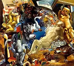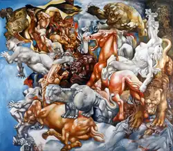 "The Rape of Europa", "Leda and the Swan, "Little red riding-hood", "Tomcats", "Woman on Horse", "Hunting Lions", and the biblical themes, especially "Peter and the Rooster", and even the renowned tragic composition "Pieta. To the victims of war" are understood in a new interpretation (but in no way a repetition) in the harmony of contrasts, and not as a confrontation between them using various styles.