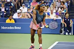 The pay gap can be defined as the relative difference in the average gross hourly earnings of women and men within the economy as a whole.[14] Of the Forbes 100 most paid athletes only one is a female, Serena Williams, who lands at number 51. Williams, however, is the highest paid female athlete according to data based in the year 2017. Within the sport of tennis, according to The New York Times, women make an average of 80 cents for every dollar a man makes. This pay gap matches the current pay gap in the workplace throughout America as well. This difference means that roughly the 15th best male player makes almost $120,500 more than a female with the same ranking.[15] In 2018, according to The Guardian, 71% of the world's top men earn more in prize money than females who have their same ranking.[15] Between 2010 and 2014 the US Women's Open final drew a larger audience than the men. The 2007 Wimbledon Championships was the first tournament that offered equal prize money for male and female athletes.[16] This may be the case during televised events and the grand slams, women are still not receiving as much in middle- and low- tier events; the most popular rationalization being that men play longer. The pay gap does not only happen while they are playing but occurs after when they make appearances on television as a tennis expert. In 2017 BBC had to disclose their pay salaries and it was found that Navratilova was paid roughly $15,000 for her assignment whereas her male counterpart, an equally as good tennis player, received between $150,000 and $200,000 for a similar assignment.[15] The pay gap also spans to endorsements in tennis with Maria Sharapova grossing $23 million in endorsements and Roger Federer grossing $65 million, which is nearly triple.[17] Males earn more in endorsements while getting paid more than females which shows a bias based on gender within the sport. Tennis remains as the one sport that has the most comparable and fair pay between men and women. Tennis receives the most female media coverage out of any other sport and is growing rapidly in popularity. According to Forbes, eight of the top ten best paid women athletes are tennis players.[18]