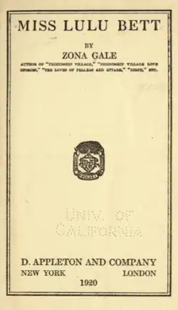 Miss Lulu Bett is a 1920 novel by American writer Zona Gale, later adapted for the stage. It was a bestseller at the time of its initial publication, but gradually fell out of favor through changing tastes and social conditions. It was the first play by a woman to win a Pulitzer Prize for Drama,