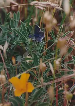 The U.S. Fish and Wildlife Service (USFWS) has a number of programs aimed at Mission blue butterfly habitat conservation, which include lands traditionally inhabited by the Mission blue butterfly, an endangered species. A recovery plan, drawn up by the U.S. Fish and Wildlife Service in 1984, outlined the need to protect Mission blue habitat and to repair habitat damaged by urbanization, off highway vehicle traffic, and invasion by exotic, non-native plants.[1] An example of the type of work being done by governmental and citizen agencies can be found at the Marin Headlands in the Golden Gate National Recreation Area. In addition, regular wildfires have opened new habitat conservation opportunities as well as damaging existing ones.