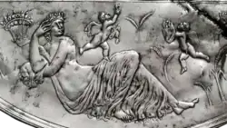 The putti fly above a reclining figure of Tellus or Terra, the Roman earth goddess. Vaguer figures from Roman mythology such as personifications, putti, and winged victories continued to be acceptable in Christian art of the Roman elite, and apparently retained for reasons of what we might call "cultural heritage", where representations of specific major deities were not. Tellus is shown in a pose that continues Hellenistic style, rather than the frontal iconic Late Antique style of the figures in the upper zone.[7] Any Christian imagery is noticeably absent.