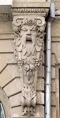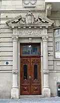 The rectangular shop spaces on the first floor are made of unsawn stone (rustication) masonry. The entrance to the yard is a metal grid and is along the axis of the central part. The architect managed to emphasize the importance of the central part by legally distributing the architectural composition of the facade on the first and second elements and strengthened it with a low attic. The pilaster side of the façade repeats the compositional method of the central fragment, where the architecturally designed, bracketed balconies are located in the appropriate convenient positions on the façade. The architect used a compact nomenclature of details and form elements to solve the façade composition. [2]