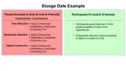 Andy Field (2009)[1] provided an example of a mixed-design ANOVA in which he wants to investigate whether personality or attractiveness is the most important quality for individuals seeking a partner. In his example, there is a speed dating event set up in which there are two sets of what he terms "stooge dates": a set of males and a set of females. The experimenter selects 18 individuals, 9 males and 9 females to play stooge dates. Stooge dates are individuals who are chosen by the experimenter and they vary in attractiveness and personality. For males and females, there are three highly attractive individuals, three moderately attractive individuals, and three highly unattractive individuals. Of each set of three, one individual has a highly charismatic personality, one is moderately charismatic and the third is extremely dull.