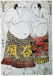 ![]() Miyagino to the right, depicted next to his more well-known contemporary, Tanikaze | |