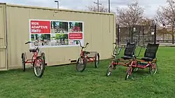 In addition to conventional bicycles, MoGo also offers a small fleet of sixteen alternative cycles, including tricycles and recumbent bicycles, for use by people with disabilities.[5][18] These specialized cycles are not compatible with the equipment of the more comprehensive MoGo rental network, and as such are only offered seasonally (from May through October) at two staffed locations (one on the Detroit River Walk, and another in Ferndale) during limited hours.