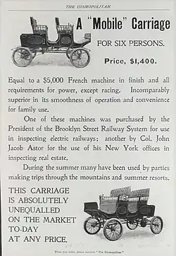 The Automobile Races held at Newport, Rhode Island in September 1900 featured a steam vehicle race won by Joseph H. McDuffee driving the Mobile. Earlier in 1900, Brisben Walker with his wife, drove a Mobile steam carriage up Pikes Peak to the timberline or approximately 10,000 feet.[4][3]