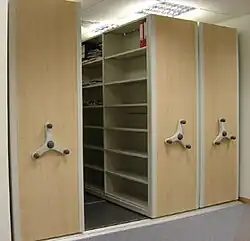Mobile shelving, mobile aisle shelving, compactus, roller racking, or rolling stack, are terms applied to shelving or storage units fitted with wheeled traction systems. Units can be closely packed when access is not required, but can be readily moved to open up an aisle to allow access. By eliminating the need for a permanently open aisle between every unit, a smaller proportion of floor space can be allocated to storage than in the case of conventional fixed shelving, or a higher capacity of storage can be met using the same footprint as fixed shelving.