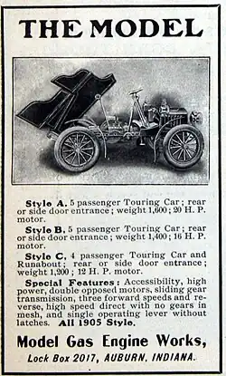 Edward A. Myers established the Model Gas and Gas Engine Company in 1901 in Auburn, Indiana. Manufacturing gasoline engines, in 1902 Model added a 2-cylinder 12-hp automobile to its products. This was joined by a 16-hp version in 1904, but a financial crisis in Auburn forced Myers to reorganize his company.[1][2]