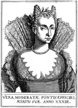 Moderata Fonte, directly translating to Modest Well,[3] is a pseudonym of Modesta di Pozzo di Forzi (or Zorzi), also known as Modesto Pozzo (or Modesta, feminization of Modesto),[4] (1555–1592) a Venetian writer and poet.[5] Besides the posthumously-published dialogues, Giustizia delle donne and Il merito delle donne (gathered in The Worth of Women, 1600), for which she is best known, she wrote a romance and religious poetry. Details of her life are known from the biography by Giovanni Niccolò Doglioni (1548-1629), her uncle, included as a preface to the dialogue.[6]