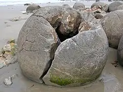 The Moeraki Boulders (officially Moeraki Boulders / Kaihinaki) are unusually large spherical boulders lying along a stretch of Koekohe Beach on the wave-cut Otago coast of New Zealand between Moeraki and Hampden. They occur scattered either as isolated or clusters of boulders within a stretch of beach where they have been protected in a scientific reserve. These boulders are grey-coloured septarian concretions, which have been exhumed from the mudstone and bedrock enclosing them and concentrated on the beach by coastal erosion.[1][2][3][4] Especially in recent years, the boulders have been a popular tourist attraction.[3][5][6]