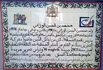 Mohamed Hassan Ouazzani was born in 1910 in Fez, and grew up in his hometown, studying at the University of al-Qarawiyyin. In 1927, he went to Paris to pursue his studies in political sciences. In 1933, he founded the nationalist French-speaking newspaper L'Action du Peuple, which was the first anti-colonial French-speaking newspaper in Morocco.[1]