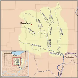 The Mohican River is a principal tributary of the Walhonding River, about 40 miles (64 km) long,[4] in north-central Ohio in the United States. Via the Walhonding, Muskingum and Ohio Rivers, it is part of the watershed of the Mississippi River, draining an area of 999 square miles (2,590 km2).[5]