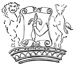The arms of Mohun (ancient) survive at Mohuns Ottery: "There, on a shield in the spandrel, is carved, amid elegant scroll work and foliage, the old coat-armour of the family — an arm vested in an ermine maunch, the hand grasping a golden fleur-de-lys; a bearing, which, for some reason unknown, John de Mohun, Baron of Dunster, who died in 1330, abandoned for the afterward well-known coat, adopted also by the Abbeys of Newenham and Bruton — a cross engrailed sable, on a field or".[26]