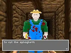 At the end of the cave, the player finds Julia. She tells the player that she came into the cave to end her life. Julia tells the player that her husband had found a golden nugget whilst mining in the cave, but buried the nugget and disappeared. Her son had come into the cave searching for his lost father, and also met the same fate. Julia asks the player assist her in ending her life. The player may choose to kill her, or refuse to do so and seek help. Regardless of the choice, the player will be covered in blood. Upon exiting the cave, players encounter a person, who is the stand-in for the next player who will play the game. Players are required to input a response to the same three questions asked of the blood-stained figure when they entered the game, revealing that the figure they met earlier was a stand-in for the previous person that had completed the game.[2] The game then ends, with the player being told that it is up to the next player of this game to choose their fate; players are invited to input their name and email address to receive the information on the outcome of the succeeding player's decision to kill or spare them.[2]