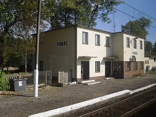 Mokrz railway station is a railway station serving the village of Mokrz, in the Greater Poland Voivodeship, Poland. The station is located on the Poznań–Szczecin railway. The train services are operated by Przewozy Regionalne.