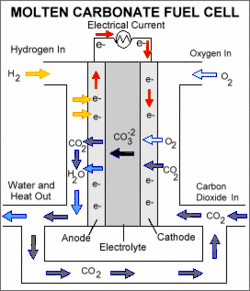 3. ^ a b "Tutorial: Molten Carbonate Fuel Cell (MCFC)". National Fuel Cell Research Center - University of California, Irvine. Archived from the original on 2018-10-08. Retrieved 2015-11-02.