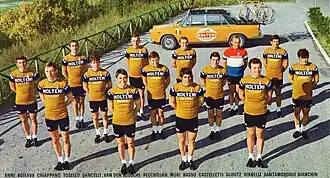The Molteni team began in 1958 with Renato Molteni as team manager.[3] It was started by Pietro Molteni. The team was also managed by his son, Ambrogio Molteni, a former professional rider.[4] The former Italian road champion, Giorgio Albani, finished his career with Molteni in 1959 and came back two years later as directeur sportif.[5] The team had success with Gianni Motta in the 1966 Giro d'Italia and Michele Dancelli in the classics. Merckx joined at the end of 1970, having twice won the Tour de France and two editions of the Giro d'Italia. Molteni became predominantly Belgian and took many of Merckx's teammates from Faemino–Faema, including his directeur sportif, Guillaume Driessens.[6] Albani replaced Driessens and directed the team with Robert Lelangue from 1972 to 1976. Other directeurs sportifs included Marino Fontana. After 1976 Molteni retired from the peloton.