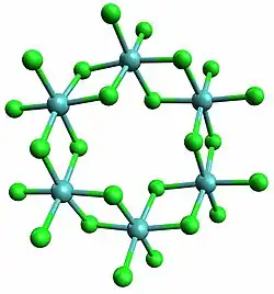 The α polymorph is a polymer. The β polymorph is a hexamer. In both polymorph, the Mo center is octahedral with two terminal chloride ligands and four doubly bridging ligands.[1] In addition to these two binary phases, a number of adducts are know with the formula MoCl4L2 where L is a Lewis base.