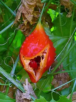 Momordica balsamina is a tendril-bearing annual vine native to the tropical regions of Africa, introduced and invasive in Asia, Australia, Central America, and North America, where they have been found in some parts of Florida.[1] In 1810, Thomas Jefferson planted this vine in his flower borders at Monticello along with larkspur, poppies, and nutmeg.[2]