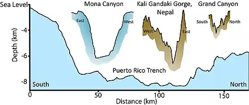 Mona Canyon (Spanish: Cañón de la Mona), also known as the Mona Rift, is an 87-mile-long (140 km) submarine canyon located in the Mona Passage, between the islands of Hispaniola (particularly the Dominican Republic) and Puerto Rico, with steep walls measuring between 1.25 and 2.17 miles (2.01 and 3.49 km) in height from bottom to top. The Mona Canyon stretches from the Desecheo Island platform, specifically the Desecheo Ridge, in the south to the Puerto Rico Trench, which contains some of the deepest points in the Atlantic Ocean, in the north.[1][2] The canyon is also particularly associated with earthquakes and subsequent tsunamis, with the 1918 Puerto Rico earthquake having its epicenter in the submarine canyon.[3]