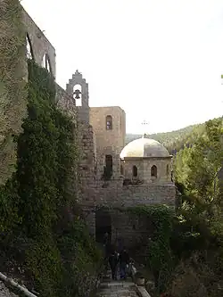 The monastery has a church and is built next to the grotto in which St John is said to have lived, which now functions as a chapel.[1] The monastery also contains the spring known in Arabic as ‘Ain el-Habis, 'spring of the hermit', and the tomb of Elizabeth, St John's mother.[1]