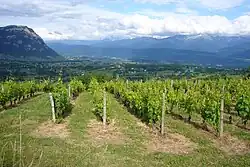 In 2009, there were 300 hectares (741 acres) of Mondeuse noire planted in France the vast majority of it in the Savoie wine region and the departments of eastern France.[3] Here it is a permitted grape variety in the Appellation d'origine contrôlée (AOC) wines of Bugey in the Ain department and Vin de Savoie as well as the vin de pays wines of the region labeled under zonal designation of Vin de Pays d'Allobrogie. In Bugey, Mondeuse noire is permitted to be blended with Gamay and Pinot noir in the red and rosé wines of the AOC provided that the grapes are harvested to a yield no greater than 45 hectoliters/hectare (approximately 2.4 tonnes/acre) and the finished reaches at least 9% alcohol by volume. Bugey wines can also allow one of the villages in the region along the Rhone and Ain to hyphenate their names along to the AOC designation provided the harvest is restricted to no more than 40 hl/ha and the wine is made above the minimum alcohol level of 9.5%.[9][10]