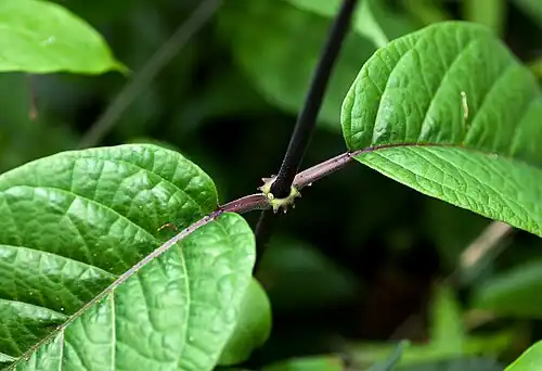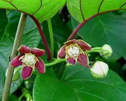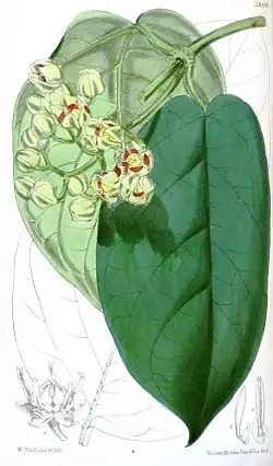 With older stems becoming woody, it grows from a tuberous rootstock which has a ginger or liquorice taste and an aroma reminiscent of vanilla. The opposite leaves are large (100–300 x 50–150 mm) with a cordate base and 30–55 mm long petioles which, with the lower-surface veins, are often reddish-purple. The false stipules are large and fimbriaceous. The inflorescence is axillary and branched, flowers are short-lived, lasting 3–4 days. Petals are reddish-purple, ± 14 mm long and with a green edge. The flowers are unusually large for the subfamily Periplocoideae, and have a malodorous fruity scent which grows as the day progresses. The paired large fruits or follicles (75–100 x 44 mm) are semi-woody with a velvety surface.