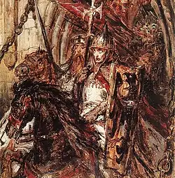 The Mongols then reached Polaniec on the Czarna Hańcza, where they set up camp.[10] There, the Voivode attacked them with the remaining Cracovian knights, which were few in number, but determined to vanquish the invader or die. Surprise gave the Poles an initial advantage and they managed to kill many Mongol soldiers. When the invaders realized the actual numerical weakness of the Poles, they regrouped, broke through the Polish ranks and defeated them. During the fighting, many Polish prisoners of war found ways to escape and hide in the nearby woods. The Polish defeat was partly influenced by the initially successful Polish knights having been distracted by looting.