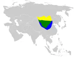| Mongolian lark range, green - resident, yellow - breeding, blue - non-breeding | |