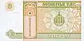 | 10 tögrög (arvan) | 125 × 61 mm | Green | 1993, 2002, 2005, 2007, 2009, 2011, 2013, 2014, 20173, 2018, 2020 | The smallest commonly used note | |||||