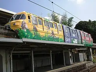 Two monorail cars, end car 101 and intermediate car 201, are scheduled to be preserved next to the former Dōbutsuen Station in their original livery of silver with red and white bodyside stripes from 19 March 2009.[7] Additionally, a single car from the defunct line is currently on display at the Spa Resort Yunohana.[8] Visitors can tour the inside and outside of the monorail car, which briefly became a location for a Japanese geocaching adventure game in Kani-city.[9] Former station Dobutsuen is the only surviving building of the line, with a piece of track and one vehicle. The rest of the line has been completely dismantled.