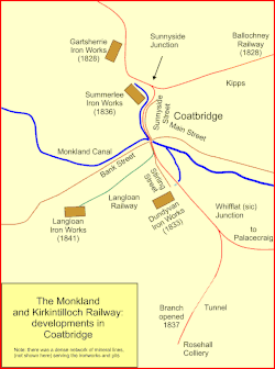 A group of interested businessmen promoted the Monkland and Kirkintilloch Railway to link the coal pits and iron works to the Forth and Clyde Canal at Kirkintilloch. If coal and minerals were transshipped there, they could reach not only Glasgow, escaping the monopoly of the Monkland Canal, but also Edinburgh.[3][4]