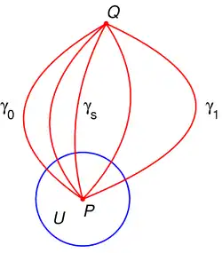 - Let be an open disk in the complex plane centered at a point and be a complex-analytic function. Let be another point in the complex plane. If there exists a family of curves with such that and for all the function is continuous, and for each it is possible to do an analytic continuation of along then the analytic continuations of along and will yield the same values at